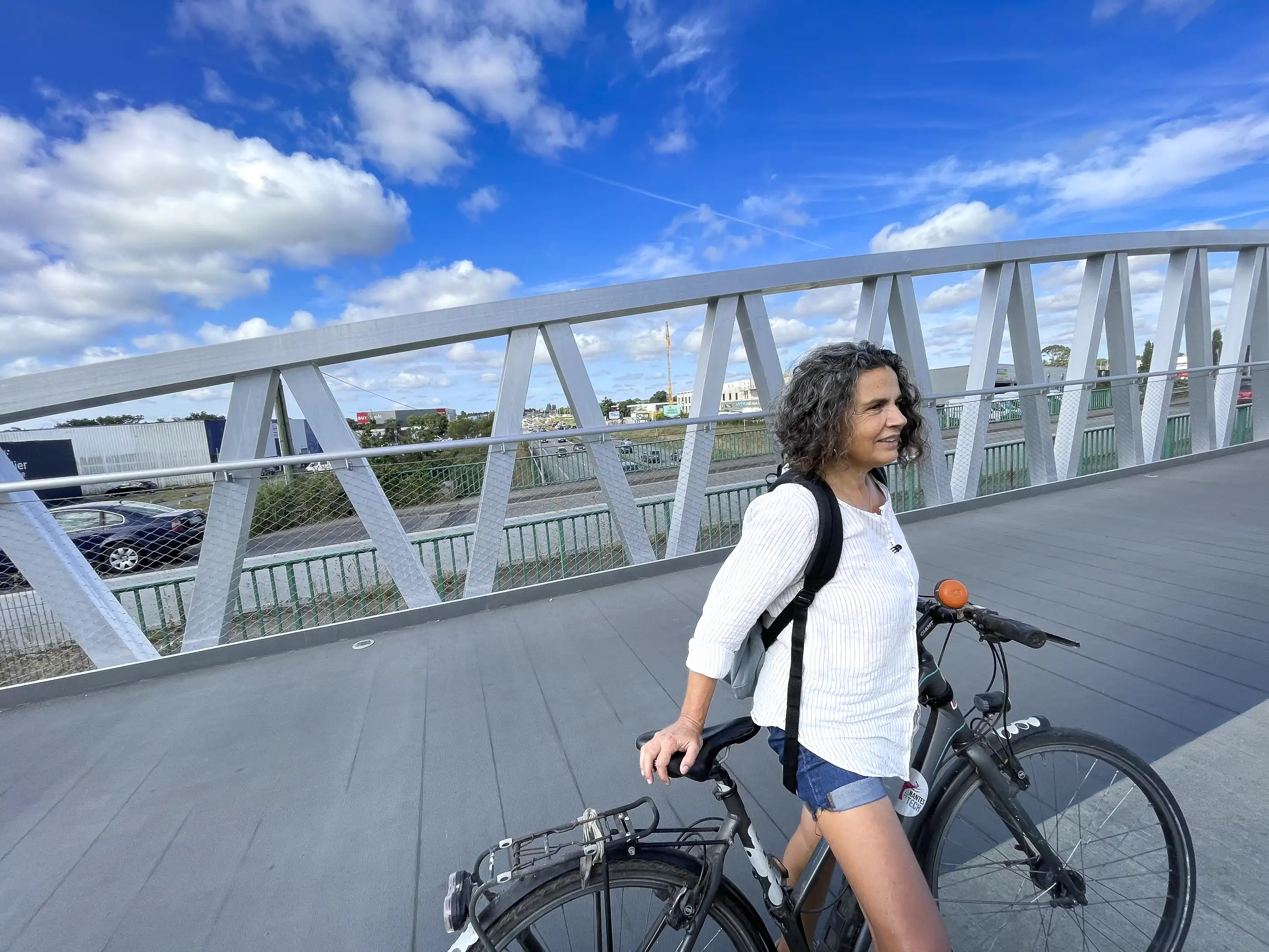 Un peu plus loin, le danger s'éloigne et, en remontant vers Plescop, le chemin balisé nous permet d’inaugurer la passerelle au-dessus de la voie express, de tester l’itinéraire dans l’autre sens et d’apprécier l’aspect roulant et sécurisé de la piste cyclable qui pénètre Vannes.
