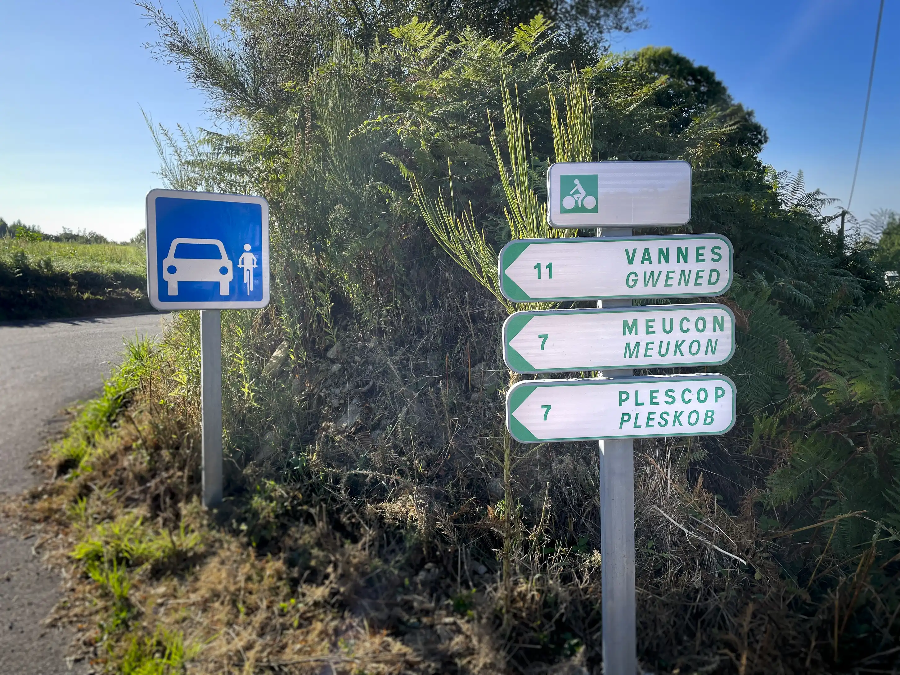 Parties du parc de Ti Kreiz Ker au coeur du bourg de Grand-Champ, nos premiers coups de pédales nous conduisent sur cette fameuse piste cyclable sécurisée sur la départementale 779. Arrivées à l’intersection de Pratel Mat, cette piste se transforme en réalité en un simple itinéraire balisé, qui nous invite à prendre les routes secondaires. Là, finies les barrières en bois qui encadrent clairement et sécurisent l’itinéraire... Seuls des panneaux signalétiques nous confirment encore que nous sommes toujours sur le bon chemin. Bonne nouvelle toutefois, il y en a à chaque intersection, ce qui nous permet de ne pas nous perdre; c'est déjà ça ! Mais, la piste rurale n'a quand même rien à voir avec les infrastructures sécurisées des pays nord-européens. Elle devient même dangereuse à l’arrivée à Vannes depuis Meucon-Saint-Avé où nous devons partager cette portion de route avec les véhicules en provenance de l’axe Triskell.